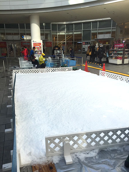 1本約135kgの氷を使用してクライアント様のご予算や会場に合わたサイズの氷原を製作致します。氷原製作は、搬入から製作完了まで約3時間で完了します。(5m×5m雪原の場合) 撤収は約2時間から3時間で完了です。(氷原サイズにより異なります) 氷原のメンテナンスの為、途中散雪を致します。オプションで降雪が可能です。
